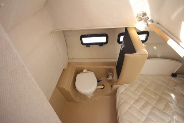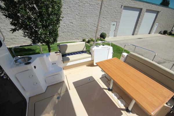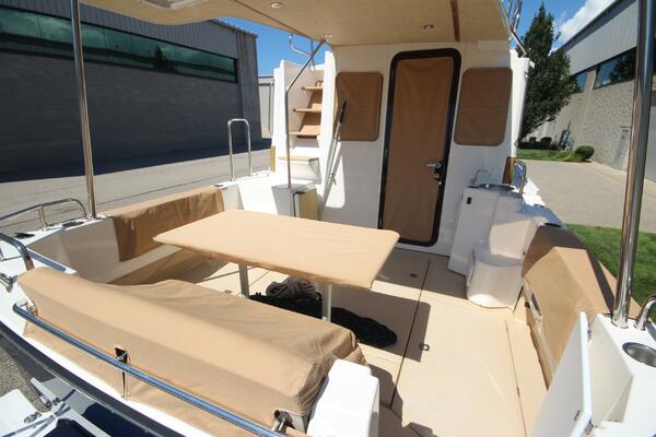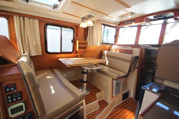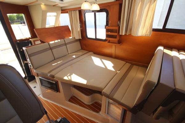 The R-31 CB was the first Ranger Tug to feature a command bridge. It is equipped with electronic controls at both the upper and lower helm stations and the redesigned bridge has a table and room to seat six. The command bridge also retracts to allow for trailering. She comes standard with bow and stern thrusters for ease of handling. The foredeck features seating and a table that can be raised for entertaining and lowered while underway. The generous cockpit also features wraparound seating utilizing hidden seats that fold out of the gunwale. The interior layout of the R-31 CB features two staterooms - one large island berth forward with en suite head and a midship berth with day head. A starboard side door provides easy access from the lower helm to the side decks for line handling. Like all Ranger Tugs, the R-31 CB comes essentially turn-key with standard features and equipment intended to make her owner’s experience hassle-free and allow for ease of handling and comfort under way.