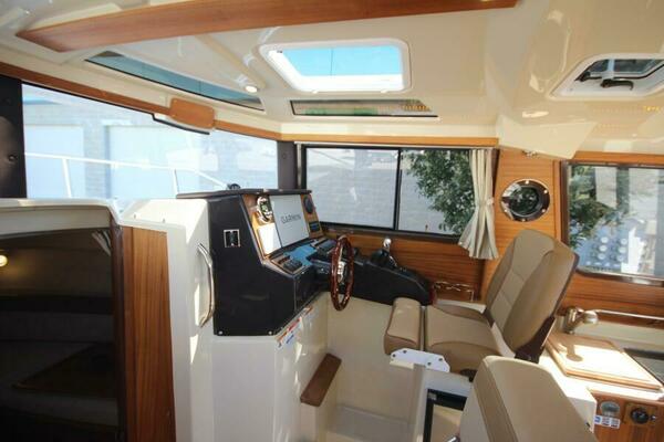 The new R-25 is a feature-packed cruiser designed for comfort, ease of use, quality and FUN! You’ll see the Ranger Tugs DNA in every facet of the R-25’s thoughtful design. Right away you’ll notice one of the most innovative features of the new R-25, the large swim step and handrails that extend aft past the outboard motor. The extended swim platform presents a clear walkway, free of all engine rigging which opens a whole new world of fishing, cruising, and water-sports opportunities. This exciting new area allows you to safely and easily board a dinghy, net a fish, step to or from a low dock (important for pets), and easily med-tie without fear of damaging your outboard and having to leap to the dock.