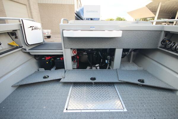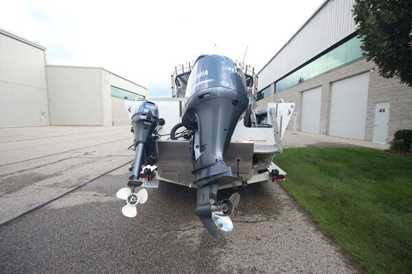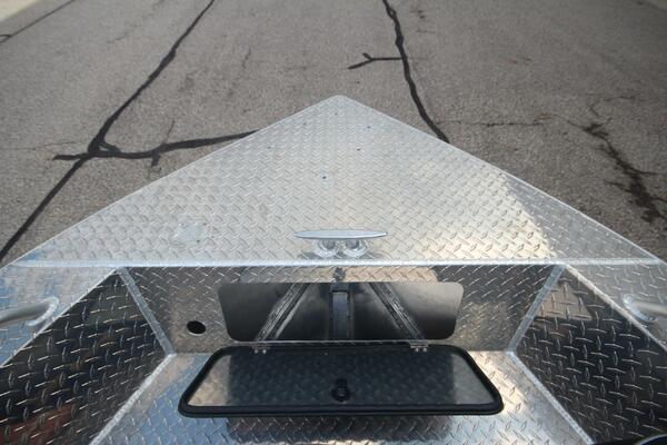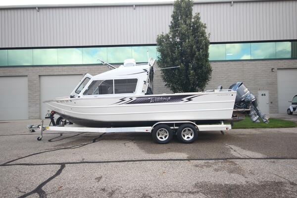 Custom fit aluminum trailer w/ twin 3,500 lb. axles, full bunk construction, hydraulic disc brakes, bearing protection hubs, waterproof LED lighting, waterproof heat shrink connections, polished aluminum step pads, 15 in. radial tires, aluminum wheels, spare tire bracket and spare tire.