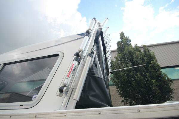 Custom Hardtop Aluminum Double Row Welded Rod Rack – 23 Tulip Style Rod Holders & Twin Aft Facing LED Spreader Lights, Port and Starboard Adjustable Wing Board Big Jon Rod Holders (6) on articulating mounts & Twin Port and Starboard Fixed Dual Net Holders. One continuous arch (sides and the top).