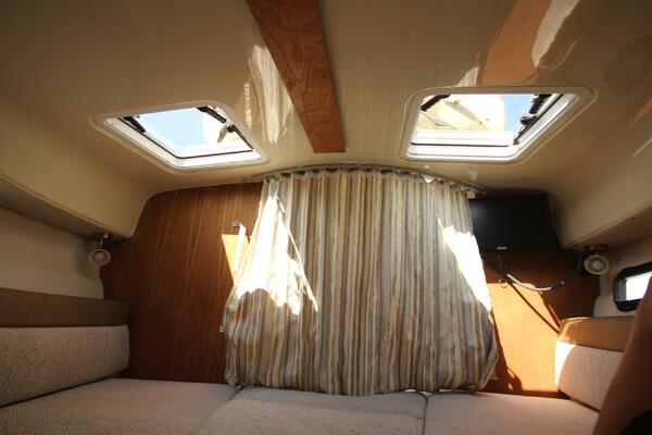 The main salon on the R-25 is light and bright making it a perfect spot to relax or entertain. The dinette seats four or converts to a bed for two. There’s even a spacious quarter berth with a removable mattress that can be used to accommodate guests/kids or for expanded storage. With its full galley, meal preparation aboard the R-25 is easy and fun. An electric/alcohol stove top, refrigerator/freezer combo, microwave, and sink with hot and cold water, make preparing food a breeze. The R-25 features a private, enclosed head with sink.