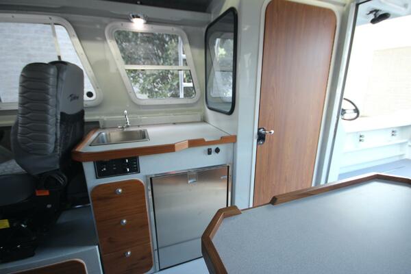 Galley with sink, faucet, 12V/110V drawer fridge, and 21 gal. fresh water tank w/ tank level monitoring system