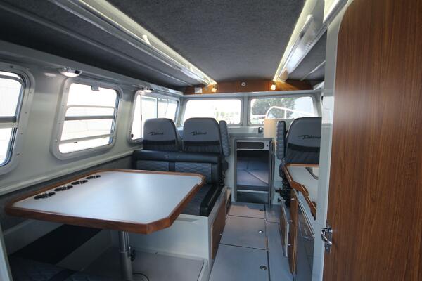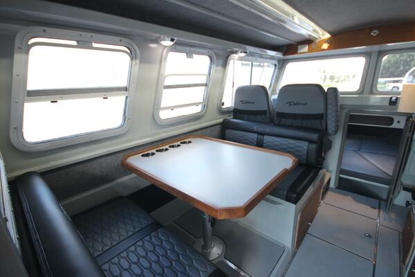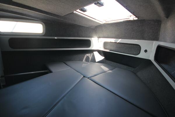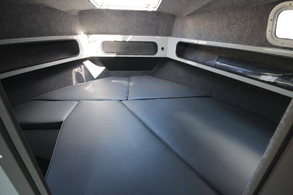 Cuddy cabin with 24" bow access hatch, storage, shelving, cushions, and 2 LED red/white cabin lights