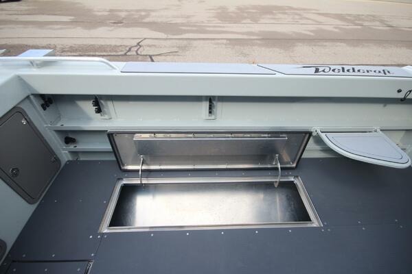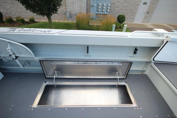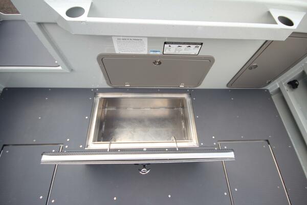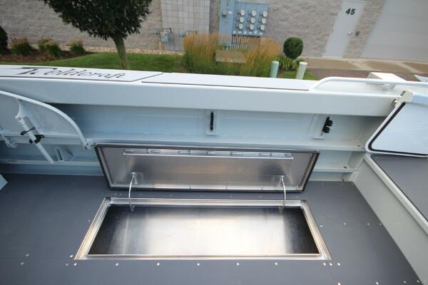 Transom w/ 42-gallon insulated fish box, cutting board lid & locking rigging compartment doors