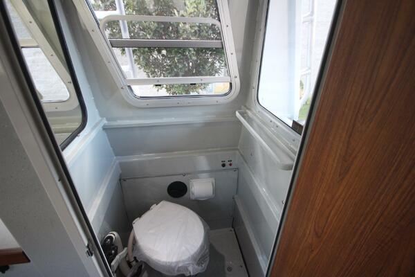 3-window head w/floor drain, electric toilet, 21 gal. holding tank, overboard discharge, and curtain package