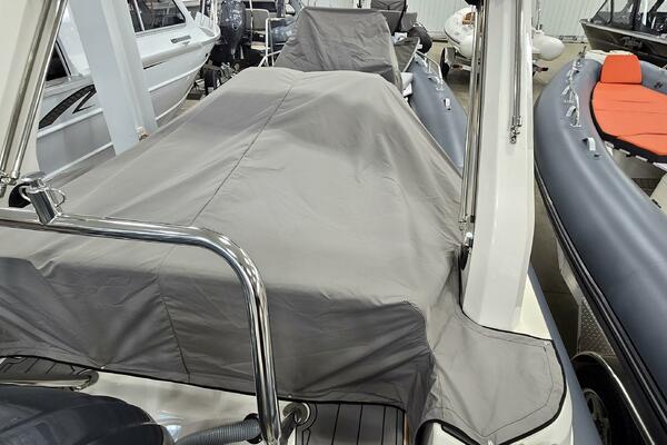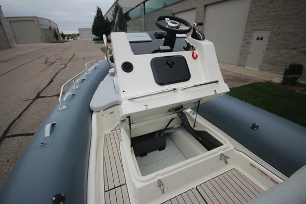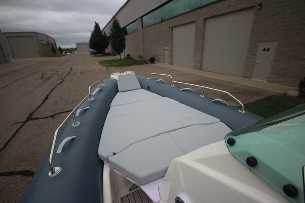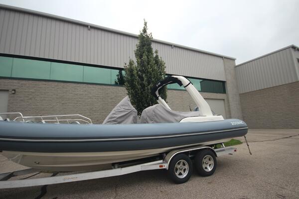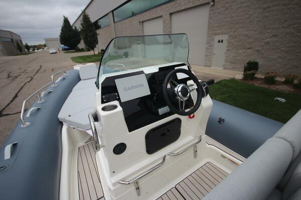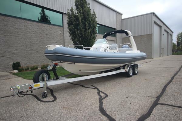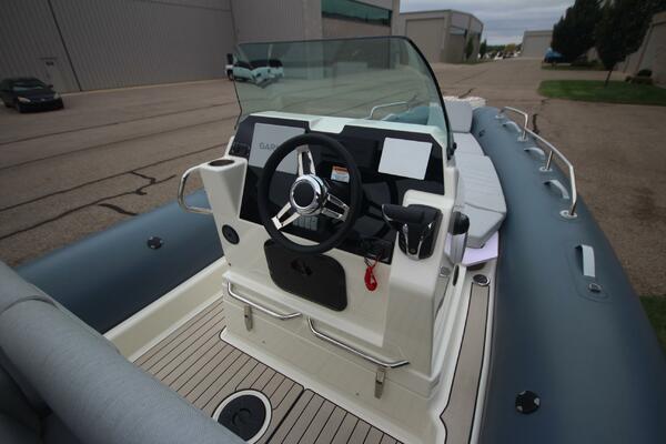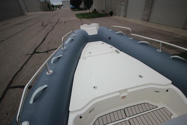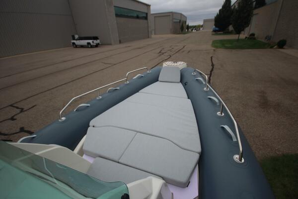 This boat has grey NEO tubes, white hull and deck and grey upholstery.